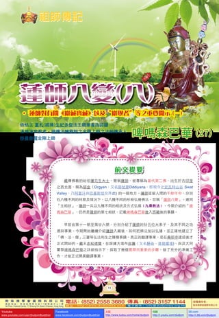 文档介绍了敦珠佛学会国际有限公司的信息,及其关于藏传佛教始祖莲花生大士的生平与教义的阐述。重点讲述了莲师的九种相状及其在藏地弘扬佛法的事迹,特别是翻译佛教经典和《巖藏寶藏》的封存及其开启的重要性。最后,文档强调了在未来会有不同的巖取者发掘这些宝藏,以利益众生。