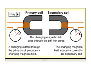 - Efficiency is affected by resistance in coils, hysteresis losses in the core, eddy currents, and magnetic flux leakage. Laminated cores and thicker wire can improve efficiency.