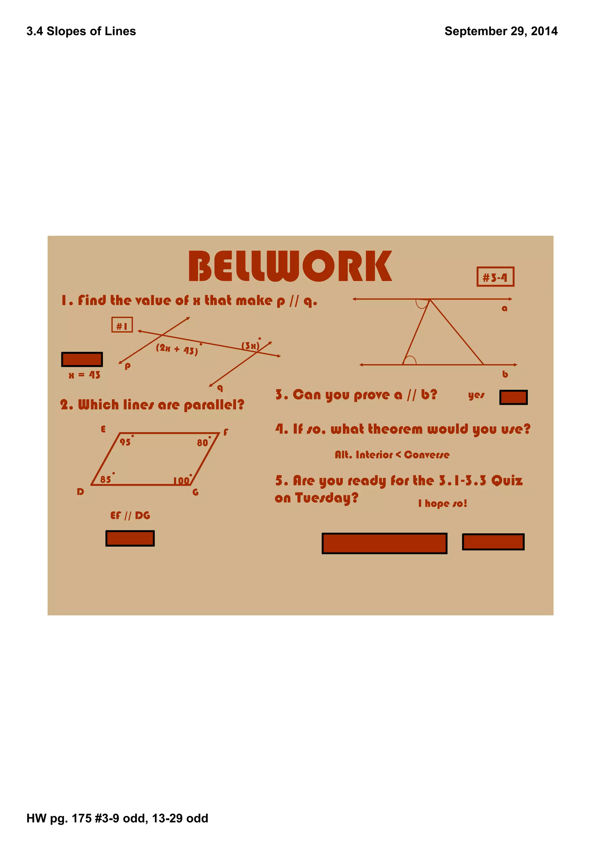 This document discusses slopes of lines. It defines slope as the ratio of rise over run between two points on a line. It describes positive, negative, zero and undefined slopes. It states the postulates that parallel lines have the same slope and perpendicular lines have slopes with a product of -1. Students are instructed to work with their group to complete problems in guided practice.