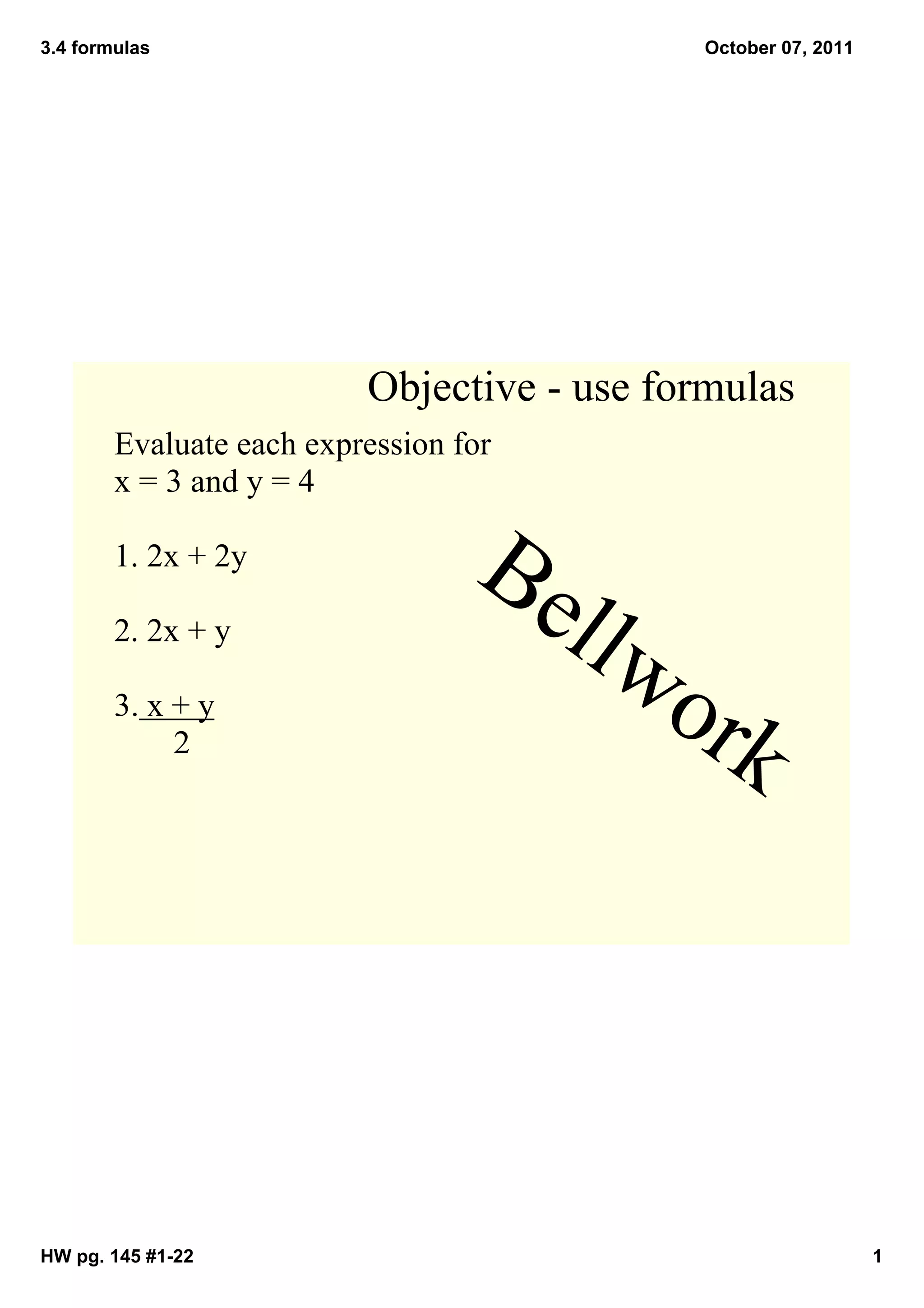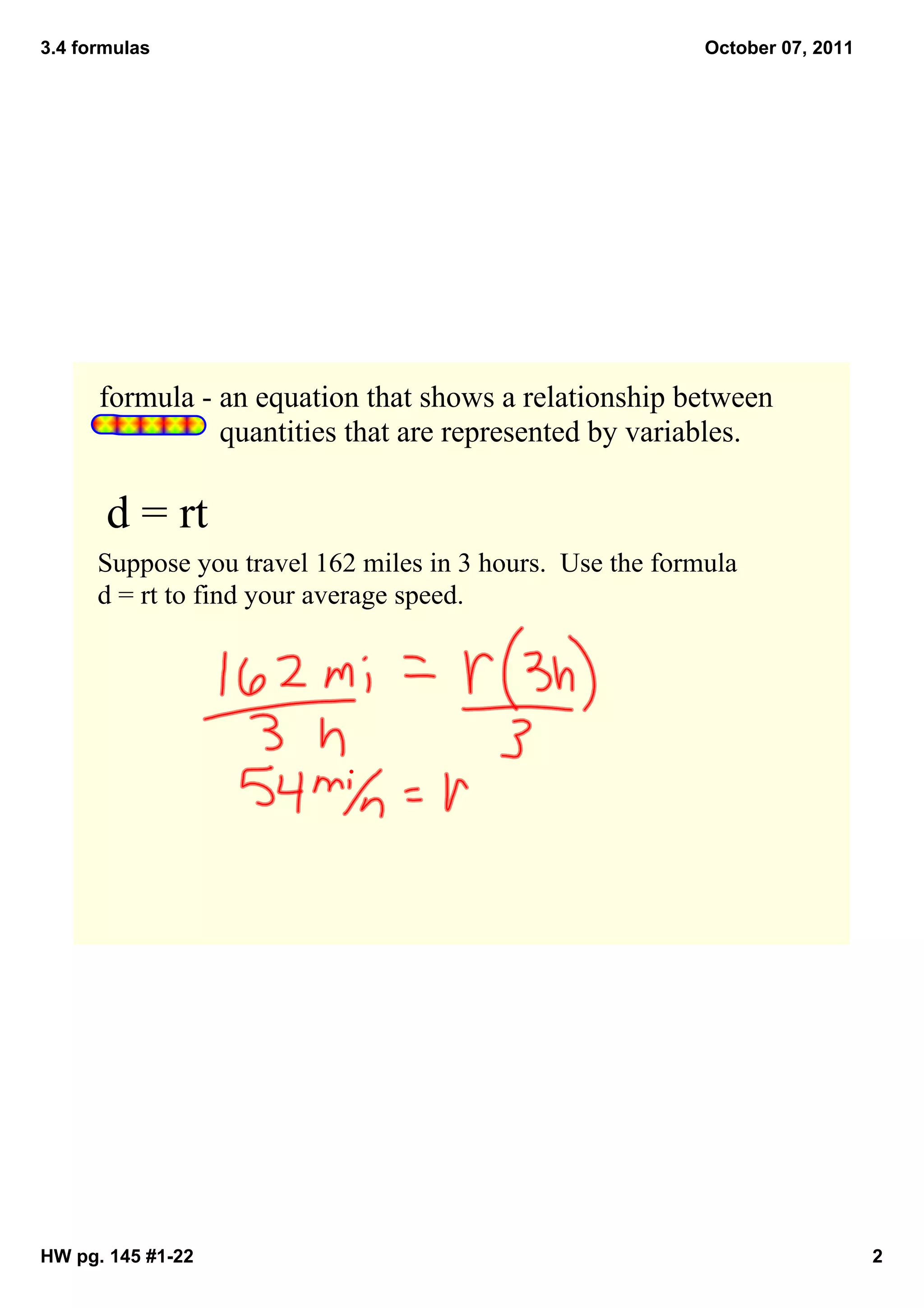 The document contains examples of using formulas to solve problems. It provides formulas for distance, rate, and time (d=rt); perimeter (P=2l+2w); estimating temperature based on cricket chirps per minute (F=n/4+37); and finding the perimeter of a room. It works through applying these formulas to calculate average speed from a distance and time, estimate temperature, and find the perimeter of a room.