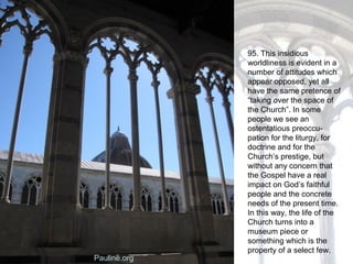 1) It is seen in an ostentatious focus on liturgy, doctrine and prestige without concern for impacting God's people or present needs. This turns the Church into a "museum piece."