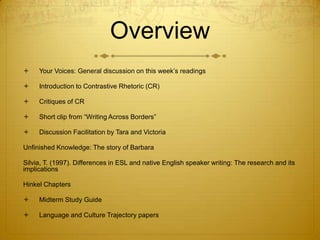 The document discusses a class that focuses on understanding the influence of culture on writing. It introduces contrastive rhetoric, which examines differences in writing across cultures. While Kaplan's early work in this area made broad generalizations, later scholars recognized that writing is influenced by many factors beyond just one's native language and culture. The class considers how to apply contrastive rhetoric insights to teaching English as a second language in a way that is critically aware of issues of power and discourse. It also discusses responding effectively and sensitively to international students' writing assignments in English.