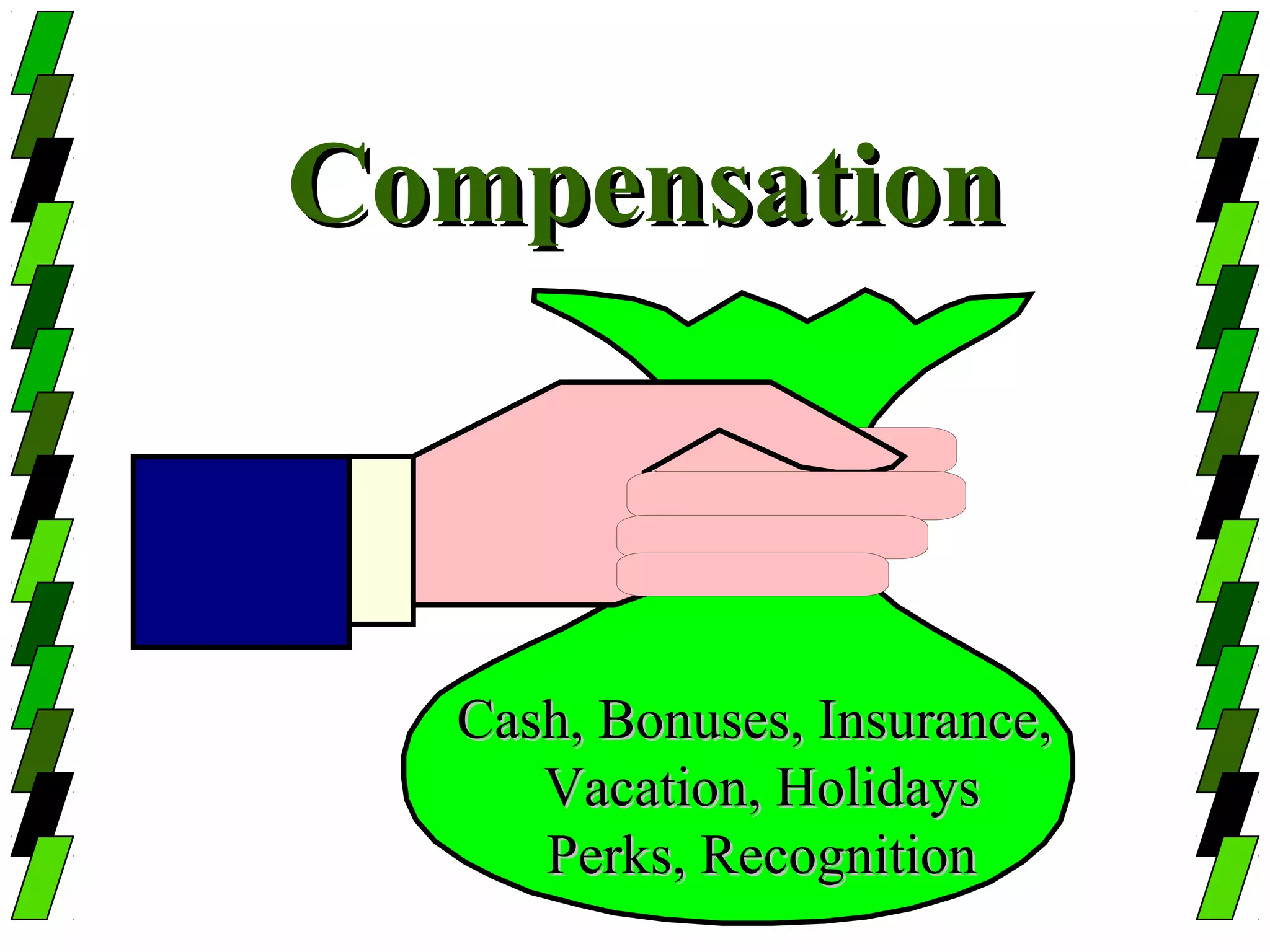 The document discusses compensation and pay structures. It defines compensation as all forms of financial return, benefits, and services employees receive for their work. It outlines the components of total compensation programs including financial components like wages and bonuses, and non-financial components like job satisfaction and work environment. The document then discusses factors that influence wage levels, steps in designing a compensation system including establishing pay levels and structures, and techniques for managing compensation including pay level, structure, and individual pay rates.
