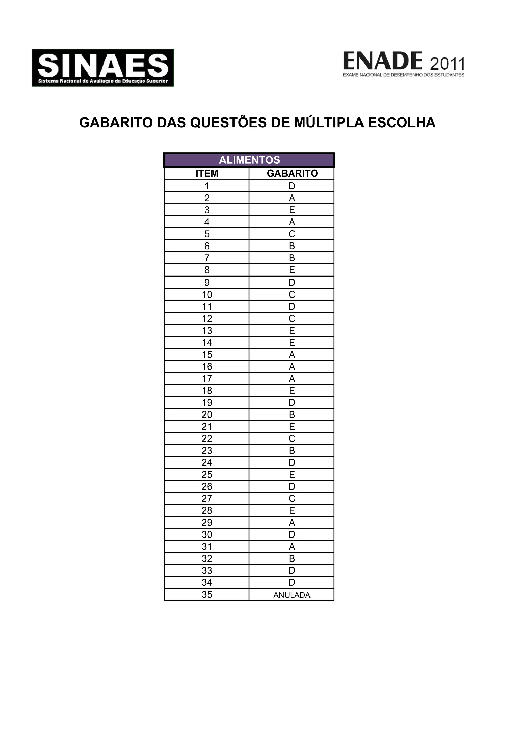 A 3 E 4 A 5 C 6 B 7 B 8 E 9 D 10 C 11 D 12 C 13 E 14 E 15 A 16 A 17 A GABARITO DAS QUESTÕES DE MÚLTIPLA ESCOLHA ALIMENTOS 17 A 18 E 19 D 20 B 21 E 22 C 23 B 24 D 25 E 26 D 27 C 28 E 29 A 30 D 31 A 32 B 33 D 34 D 35 ANULADA