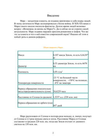 Документ представляет собой реферат о Марсе, освещая его физические характеристики, климат и историю изучения. Он обсуждает состав и внутреннее строение планеты, а также результаты различных экспедиций, проведенных для исследования Марса. В тексте также рассматриваются климатические условия и особенности поверхности планеты, включая вулканы и возможное существование воды.