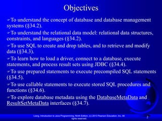 This document discusses chapter 34 of Liang's Introduction to Java Programming textbook. The chapter covers Java database programming and relational database concepts. It defines database systems and components, explains the relational data model including tables, keys, and constraints. It also provides examples of SQL commands and JDBC for interacting with databases in Java applications.