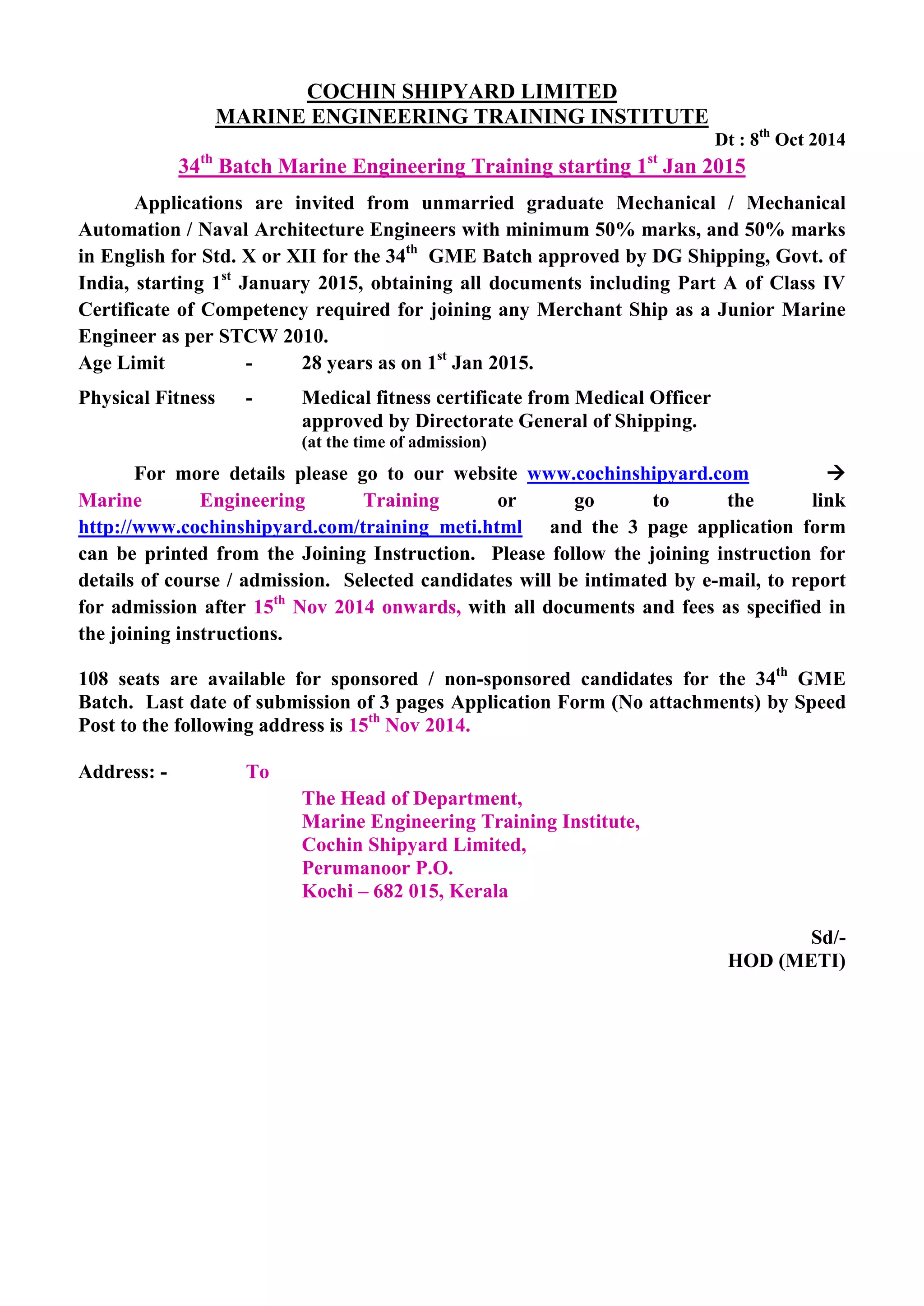 Cochin Shipyard Limited's Marine Engineering Training Institute is accepting applications for its 34th graduate marine engineering training batch starting January 1st, 2015. The 108-seat program provides training to obtain a Class IV Marine Engineer certificate. Eligible candidates must be unmarried mechanical or naval architecture graduates under age 28 with at least 50% marks in English and overall, and pass a medical exam. Interested candidates can access the application form online and must submit it by post by November 15th, 2014 to be considered for admission notifications emailed after that date.