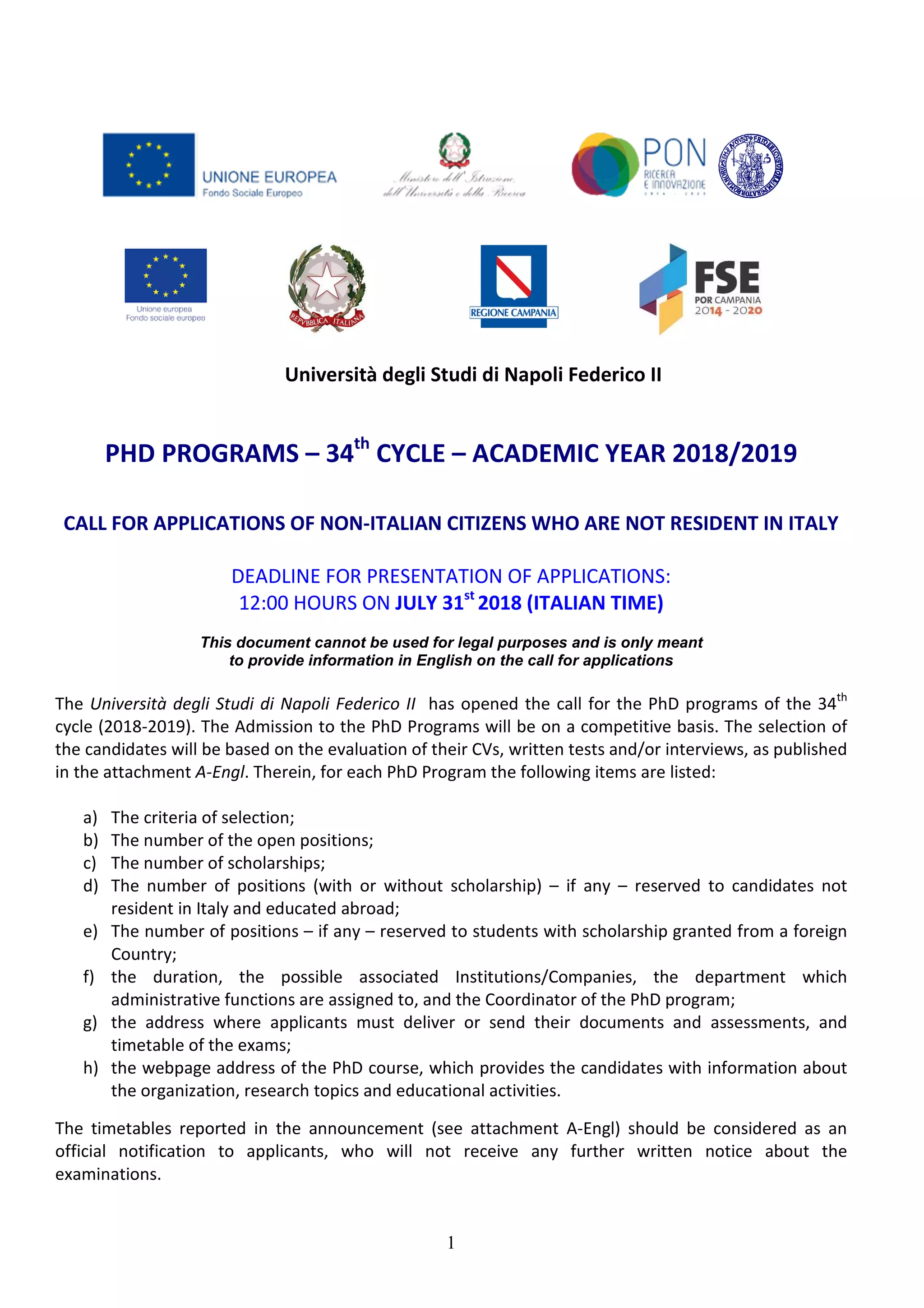 This document summarizes the call for applications for PhD programs at the University of Naples Federico II for the 34th cycle (2018-2019). It outlines the requirements, selection process, and timeline for applications. Key details include: