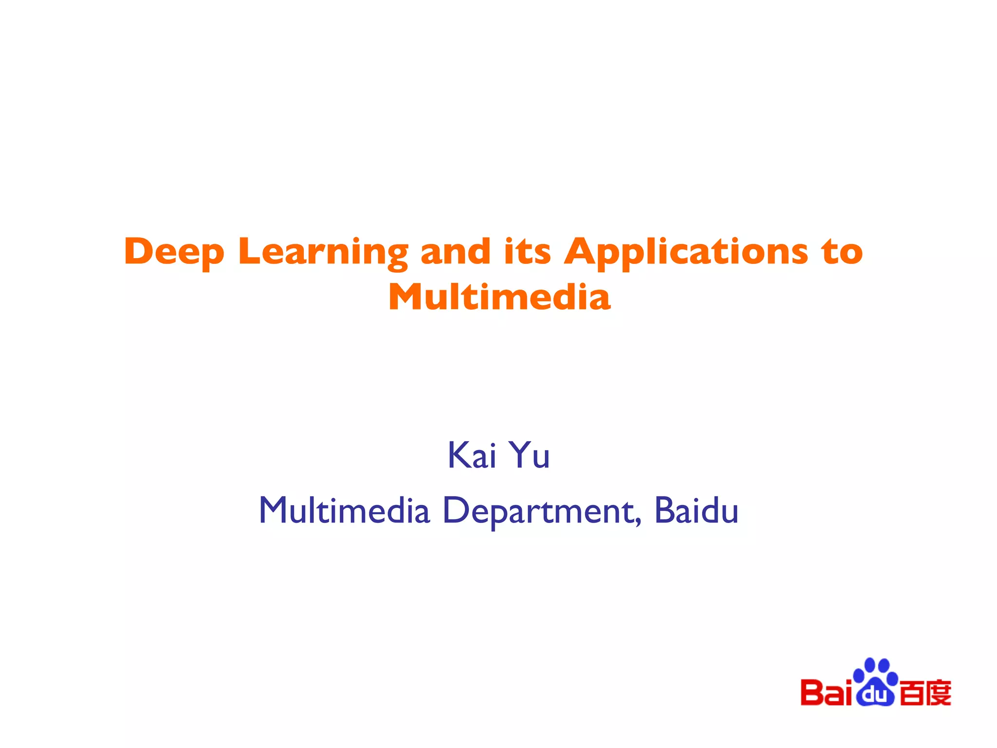 This document discusses deep learning and its applications to multimedia. It provides background on shallow models from the late 1980s and more recent developments in learning with structured data since 2000. Deep learning has seen significant progress since 2006 with improved neural networks. Convolutional neural networks achieved state-of-the-art results on the ImageNet challenge in 2012. Deep learning is also being applied successfully to speech recognition, natural language processing, and other domains. Restricted Boltzmann machines and deep belief networks are important building blocks for deep learning models. Layerwise pretraining and fine-tuning have led to improved classification results.