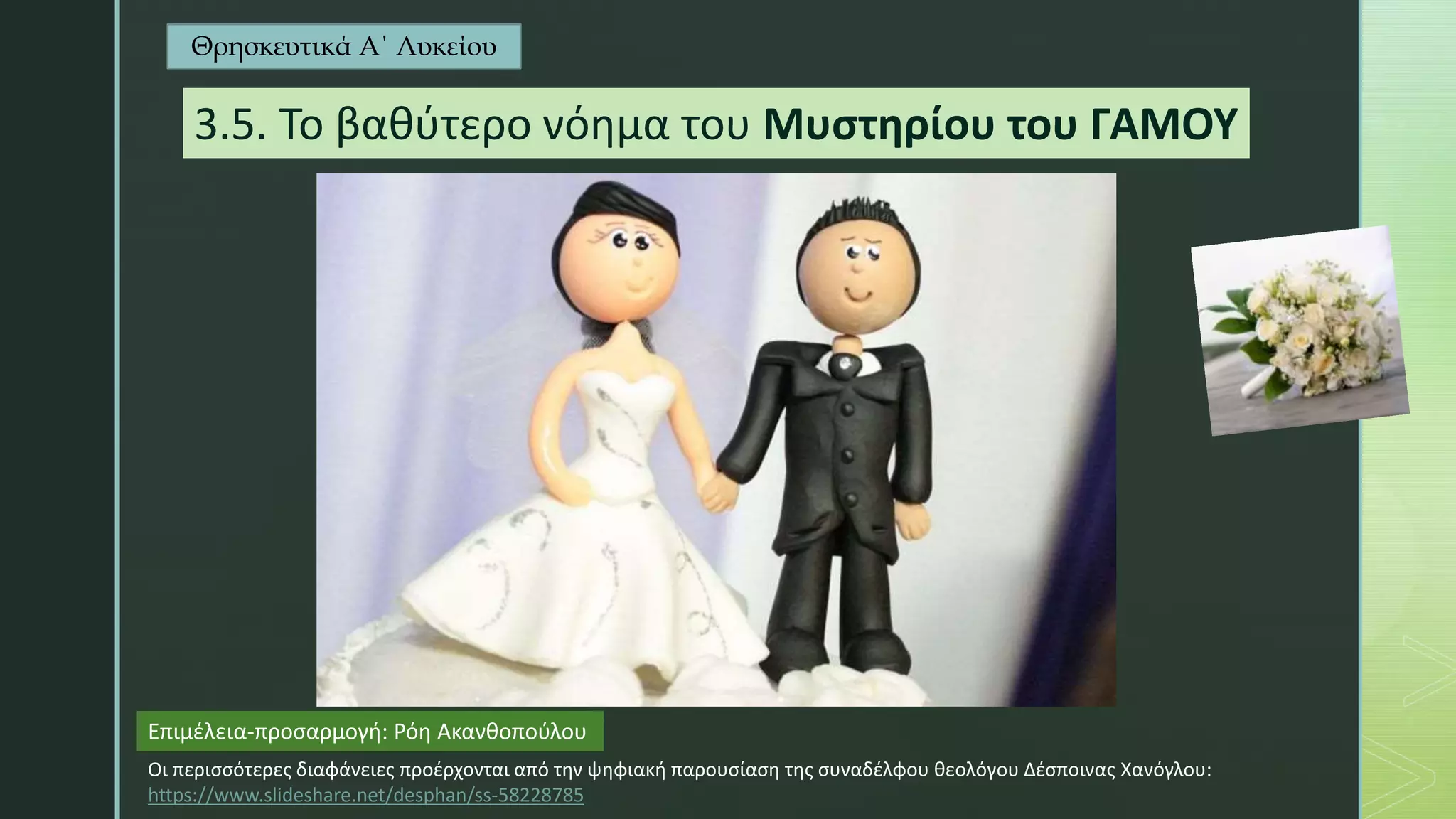 Θρησκευτικά Α΄ Λυκείου: Παρουσίαση για τη διδακτική ενότητα 3.5. Το βαθύτερο νόημα του Μυστηρίου του Γάμου. Βασίστηκε σε προηγούμενη παρουσίαση της συναδέλφου Δέσποινας Χανόγλου και προσαρμόστηκε στο νέο βιβλίο (2020-2021).