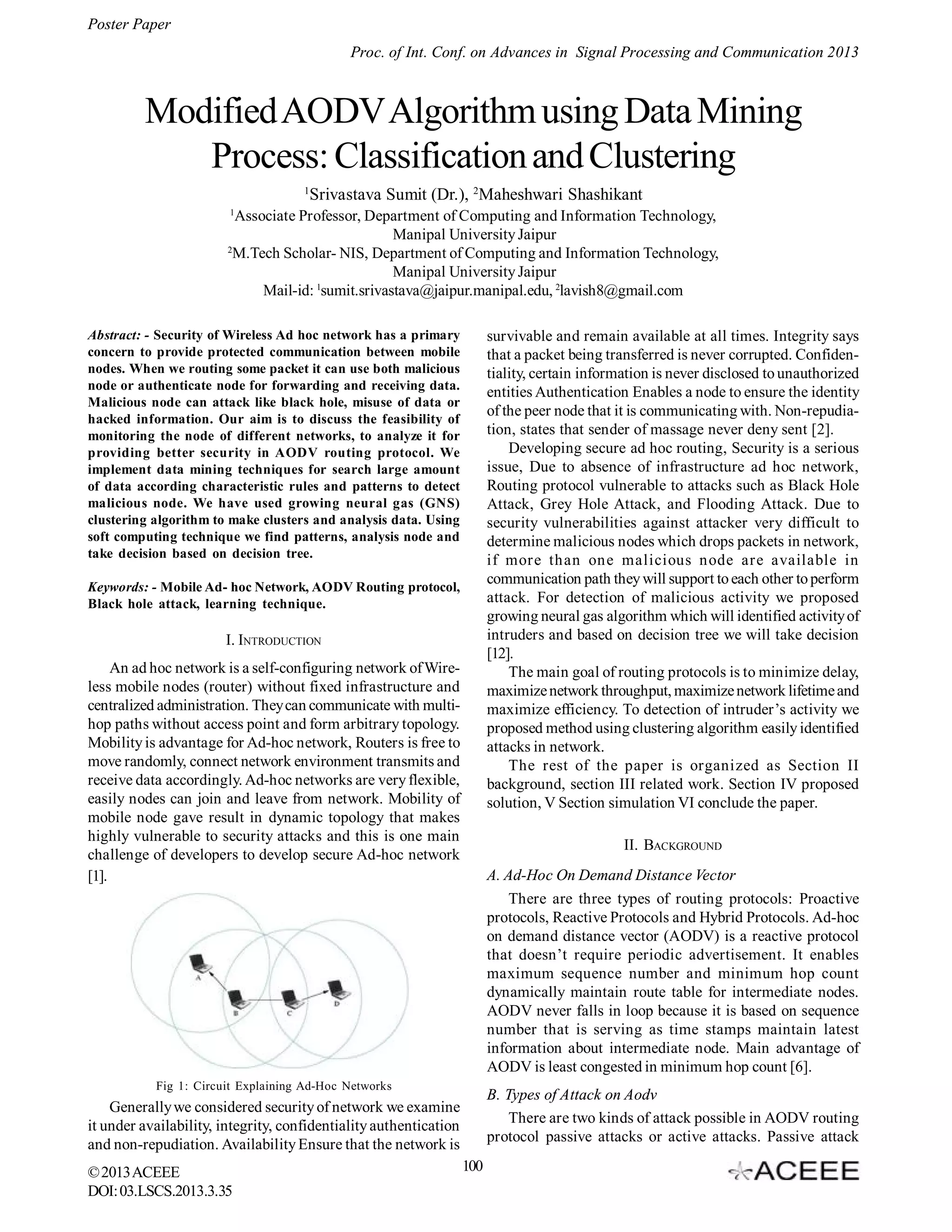 The document discusses an enhanced AODV routing algorithm for ad hoc networks, focusing on data mining techniques to detect and mitigate security threats such as black hole and flooding attacks. It employs a growing neural gas clustering algorithm to analyze network behavior and identify malicious nodes, coupled with decision tree-based strategies for effective node management. The study emphasizes the importance of implementing secure routing protocols to ensure the integrity, confidentiality, and availability of data within dynamic ad hoc networks.