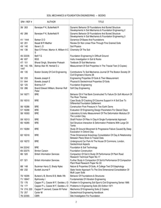 This document provides a list of books related to soil mechanics and foundation engineering. It includes the book titles, authors, and reference numbers for 73 books on topics such as soil sampling techniques, core drilling, soil testing and instrumentation, geotechnical engineering, soil properties, foundation design, and soil dynamics.
