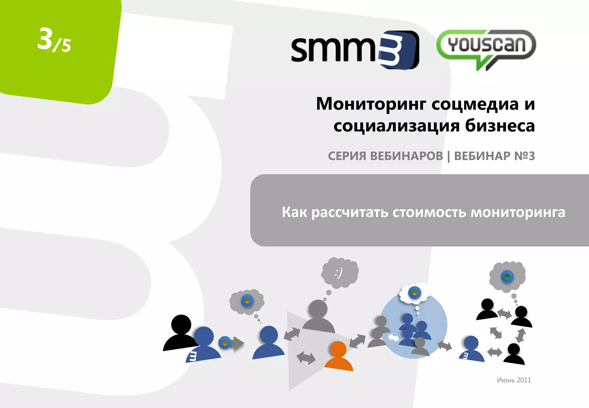 Документ представляет собой материалы третьего вебинара серии о мониторинге социальных медиа, посвященный расчету стоимости мониторинга. Основные цели вебинаров включают продвижение идеологии социализации бизнеса и обучение принципам мониторинга. Рассматриваются шаги социализации бизнеса, задания по мониторингу, составление отчетов и оптимизация процессов.