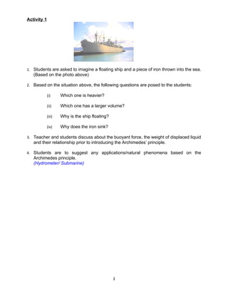 The document outlines activities and demonstrations to teach students about Archimedes' principle. It includes: 1) A demonstration using plasticine balls of different weights that float or sink in water to show the concept. 2) Questions about why a ship floats and iron sinks that lead into a discussion of buoyant force and displaced water. 3) An activity where students suggest examples applying Archimedes' principle like hydrometers and submarines. 4) Sample test questions to assess student understanding of buoyancy, floating objects, and the effects of buoyant force.
