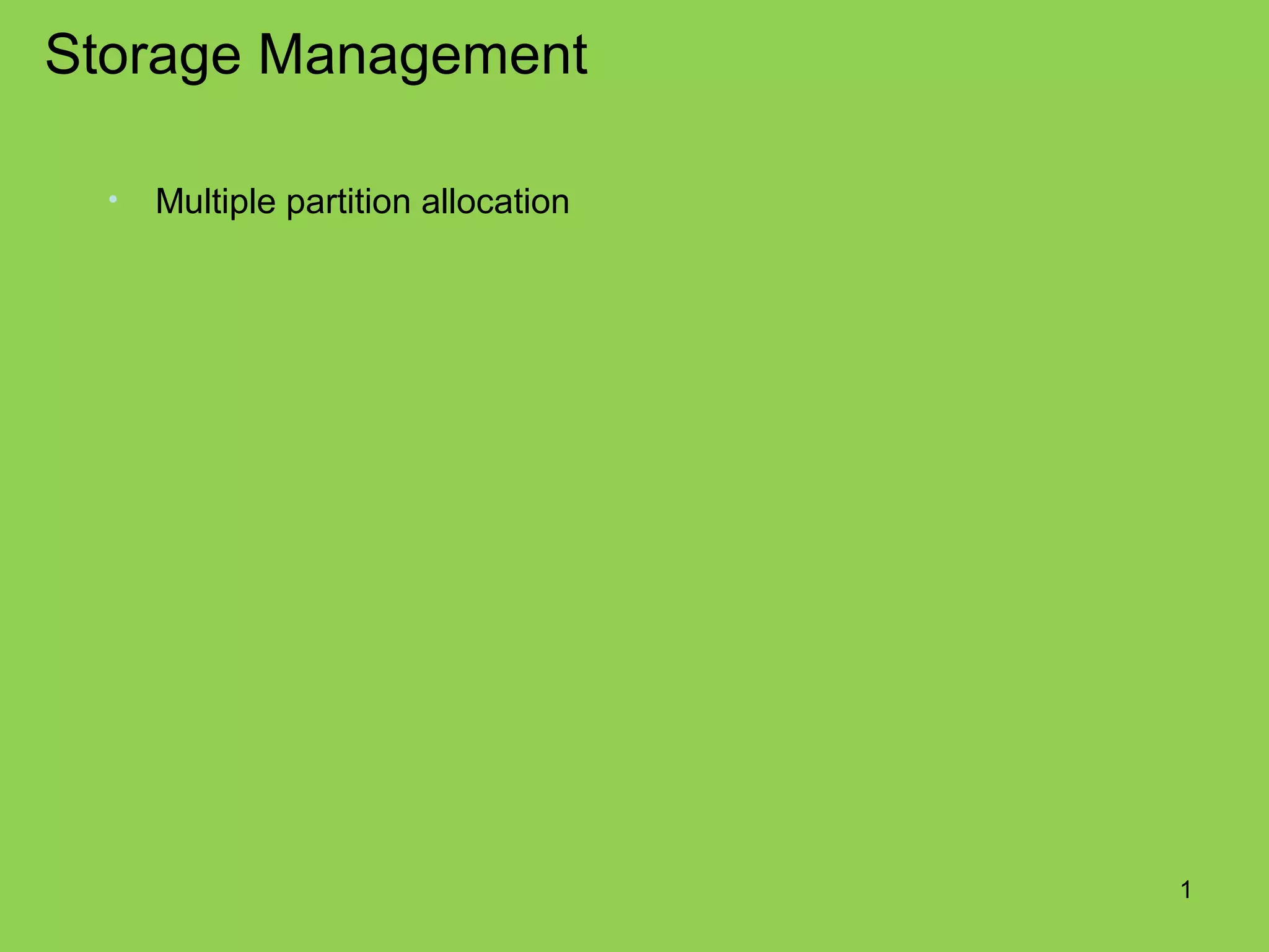The document discusses multiple partition allocation in storage management. It covers maintaining information about allocated and free partitions in a memory table. When a new process arrives, it is allocated memory from the first hole large enough to accommodate it, using approaches like first-fit, best-fit, or worst-fit allocation. The best-fit approach allocates from the smallest hole that is big enough, while worst-fit allocates from the largest hole.
