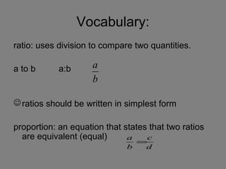 This document discusses ratios, proportions, and how to write them in simplest form. It provides examples of determining if a ratio is in simplest form, solving proportions, writing proportions based on relationships between quantities, and setting up a proportion to solve for an unknown quantity based on rates.