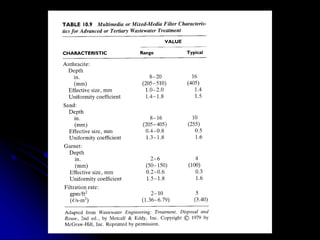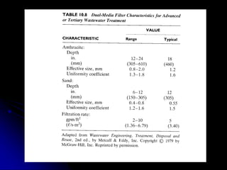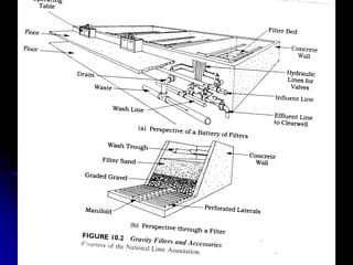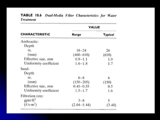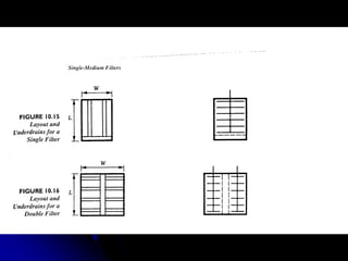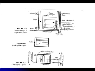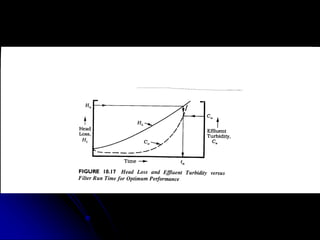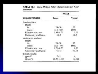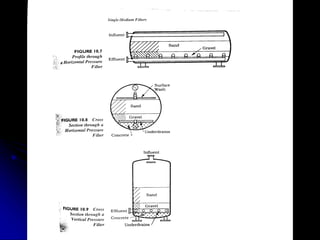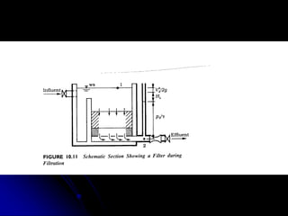 This document discusses filtration, which uses a porous medium to remove fine suspended solids from liquid. Filtration is used in water treatment and wastewater treatment. It describes different types of filters including single-medium, dual-medium, and mixed-media filters. It also discusses the filtration process, mechanisms of particle removal, head loss, filtration rates, and operational considerations like backwashing. Filtration is effective at removing suspended solids in water and wastewater treatment applications.