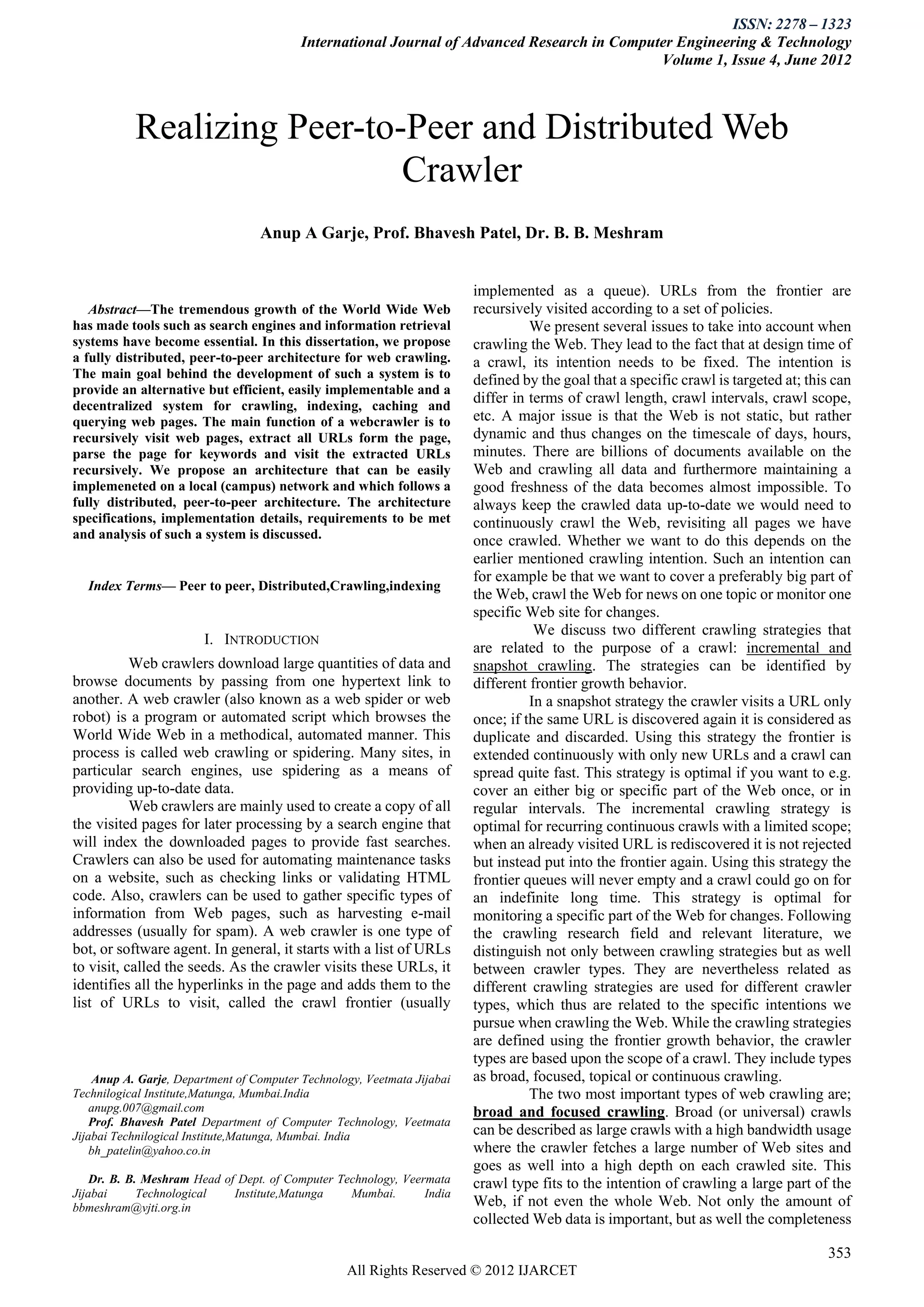 1. The document proposes a fully distributed, peer-to-peer architecture for web crawling. The goal is to provide an efficient, decentralized system for crawling, indexing, caching and querying web pages.