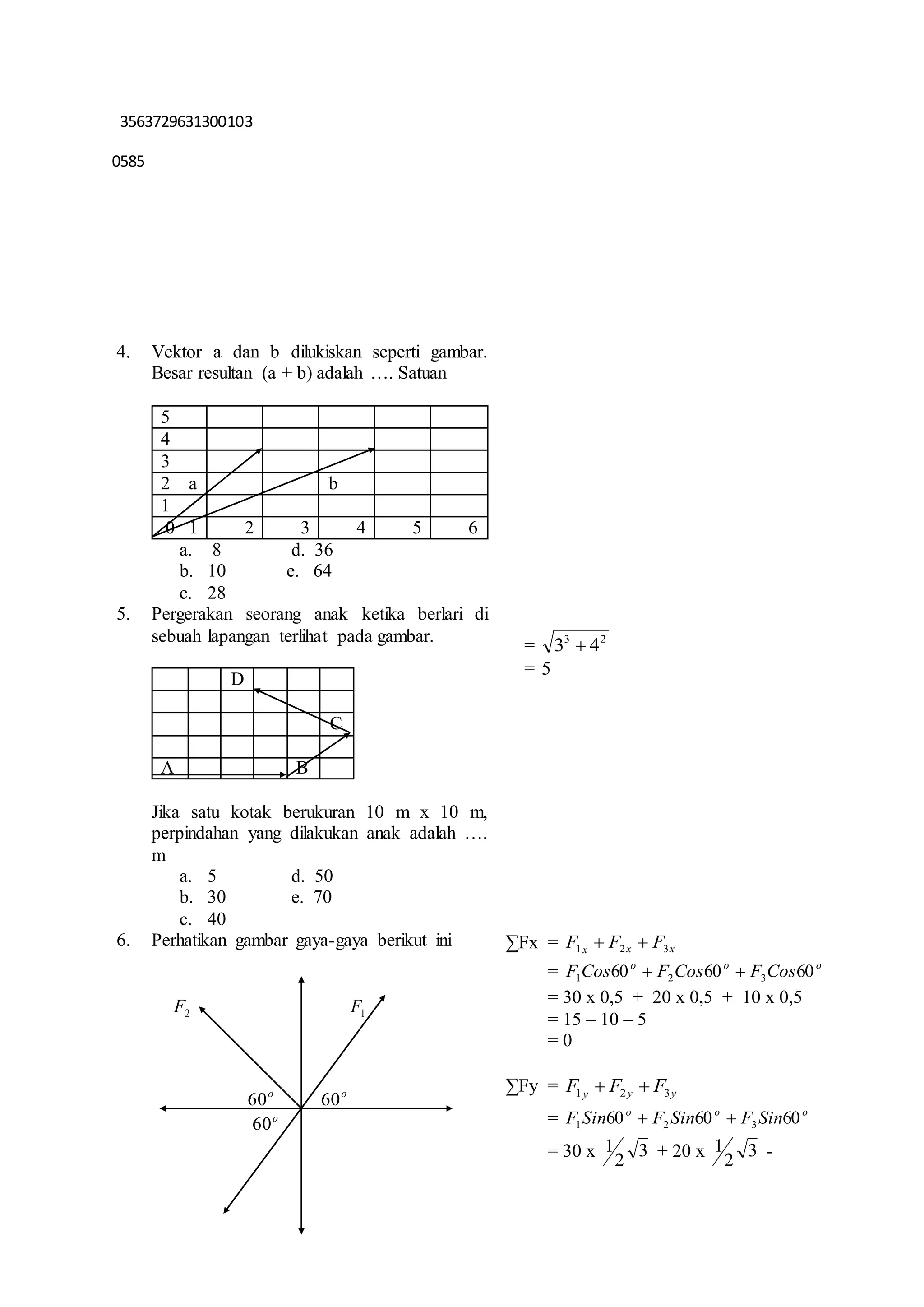 Dokumen ini berisi soal-soal fisika mengenai konsep vektor, gaya, kecepatan, percepatan, energi, dan momentum. Setiap pertanyaan dilengkapi dengan pilihan jawaban beserta perhitungan atau konsep yang terkait. Tujuan dari dokumen ini adalah untuk menguji pemahaman dan penerapan hukum fisika dalam berbagai situasi.