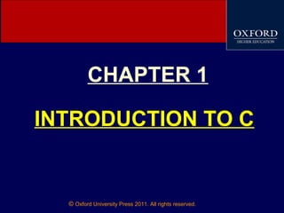 This document provides an introduction to the C programming language. It discusses the history and characteristics of C, including that it was developed in the 1970s, is widely used for systems programming, and has influenced many other languages. The structures of a basic C program and functions are described. The document also covers various aspects of C programming such as data types, variables, constants, streams, and basic input/output functions like printf and scanf. Operators supported in C like arithmetic, relational, equality, logical, and bitwise operators are also summarized.