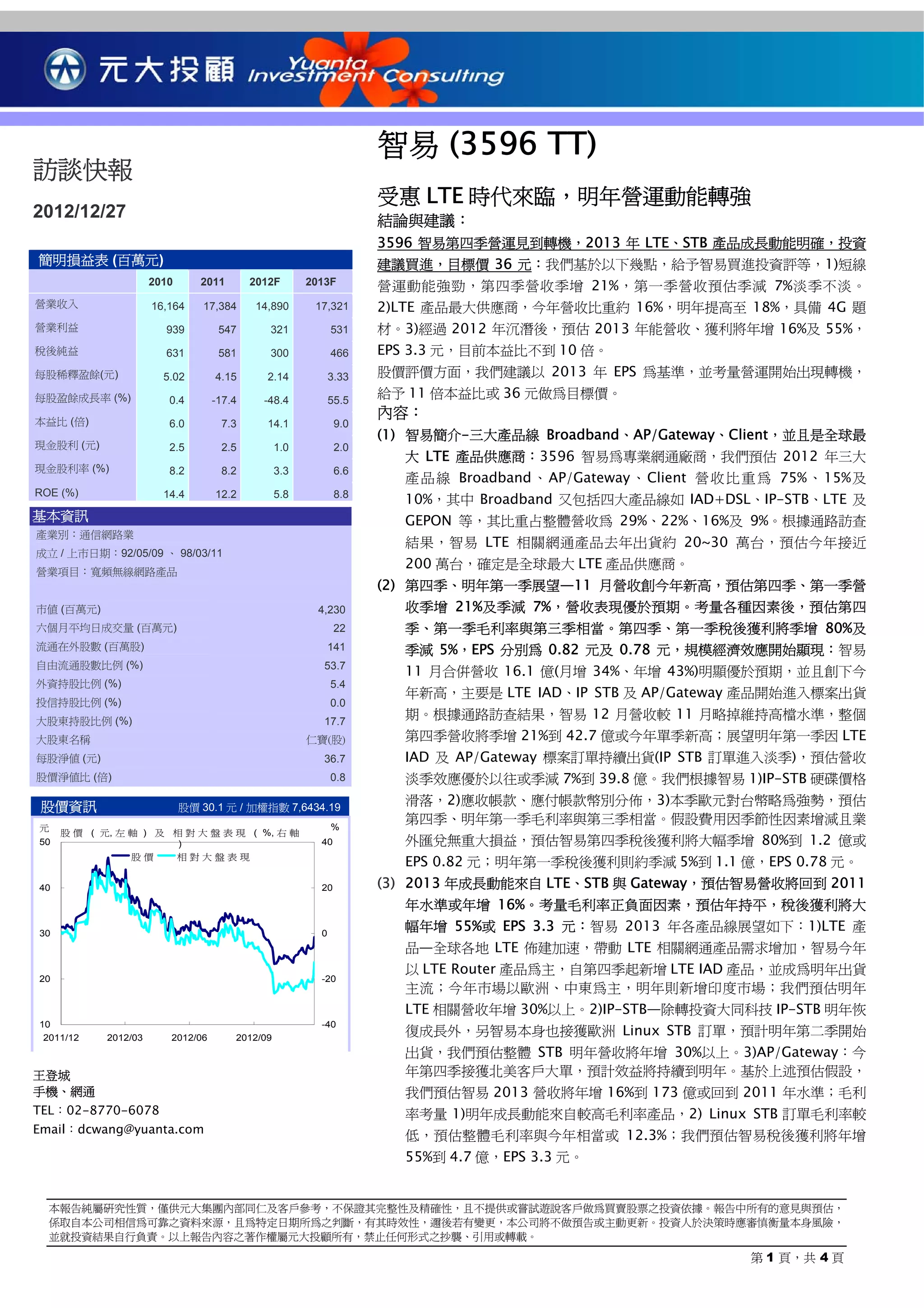 智易在2013年預計實現營收和利潤顯著增長,分別年增16%和55%。公司受益於LTE和STB產品的市場需求,並且第四季度營收表現優於預期。建議投資者買進,目標價為36元。