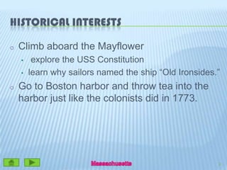 Massachusetts offers a variety of historical sites, seasonal activities, and places to stay for visitors. Some highlights include exploring historical locations like the Mayflower and USS Constitution in Boston, enjoying beautiful foliage and beaches throughout the different seasons, and visiting other areas like Cape Cod, the Berkshires, Plymouth, Salem and Cambridge which offer museums, hiking trails, skiing and more. Massachusetts provides exciting experiences for families year-round.