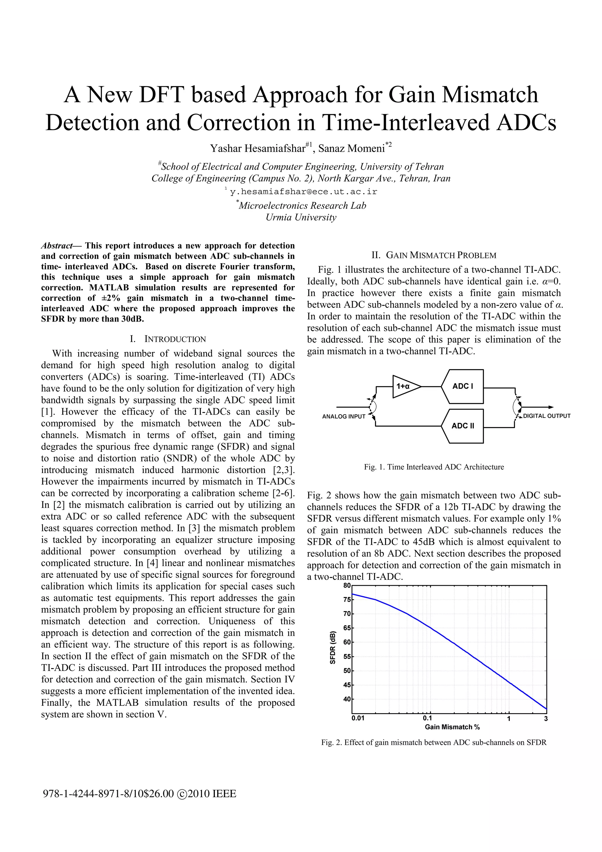 This document presents a new DFT-based approach for detecting and correcting gain mismatch in time-interleaved ADCs. It introduces the gain mismatch problem in TI-ADCs and how it reduces the spurious free dynamic range. The proposed method uses the discrete Fourier transform to detect the gain mismatch between ADC sub-channels based on the difference between the ideal DFT and actual DFT. It then introduces a feedback system using this difference signal to iteratively correct the gain mismatch. Simulation results show the approach improves SFDR by more than 30dB by correcting a ±2% gain mismatch in a two-channel TI-ADC.