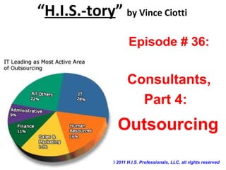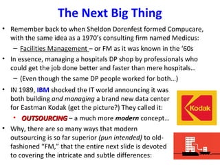 This document discusses the history and growth of outsourcing in healthcare IT. It describes how outsourcing allowed consulting firms like Superior and ACS to significantly increase their revenue by taking over hospital IT departments. Outsourcing became popular in the 1990s and spurred the growth of large consulting firms through acquisitions. Today, some of the largest HIS vendors and consulting firms generate billions in annual revenue, partly through IT outsourcing and system implementations. The document cautions hospitals to carefully consider a consulting firm's qualifications and potential conflicts of interest when engaging them for projects.