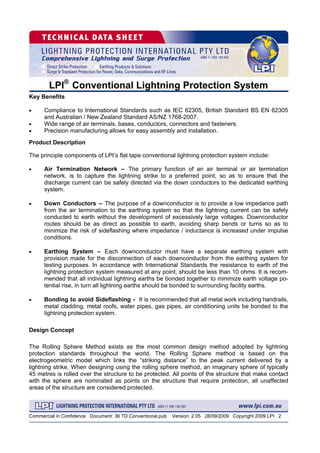 This document describes LPI's conventional lightning protection system which uses copper tape and components like air terminals, down conductors, and earthing systems. It provides specifications for the system's copper air rods, elevation rods, multiple points, brackets, saddles, bases, tape, and clips. The system is designed according to the rolling sphere method to safely direct lightning strikes via air terminals to the grounding system and protects structures by bonding metal components.