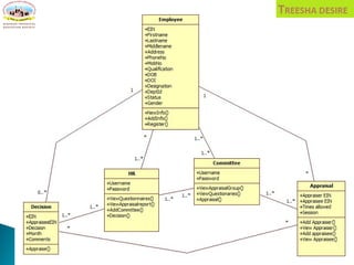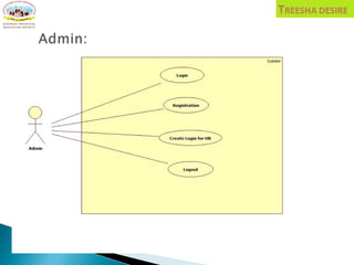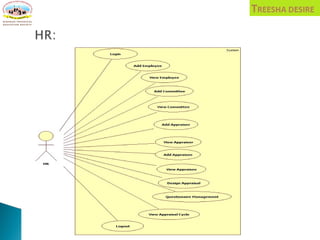 The document describes a proposed HR management system called 360D. It includes sections on the existing manual system's problems, objectives of the new system, its scope and modules. The system would integrate various functions like employee management, leave management, payroll etc. It provides diagrams of the system architecture including ERD, DFD, use case etc. It also describes the system requirements, interfaces, limitations and proposed enhancements.