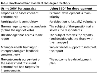 360 degree feedback is a performance evaluation method that incorporates feedback from subordinates, peers, managers, customers, and others. It measures soft skills like teamwork, leadership, and character. Most organizations use 360 degree evaluations to assess employees and help them develop their careers by identifying areas for improvement. The evaluation provides a more comprehensive view of performance but requires time and training to implement effectively and avoid tensions between employees.