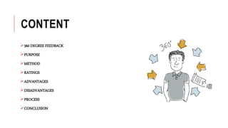 The document discusses 360 degree feedback, which involves gathering feedback about an employee from subordinates, colleagues, supervisors, and a self-evaluation. It is intended to help employees understand their strengths and weaknesses and improve performance. The document outlines the purpose, methods, ratings, advantages, disadvantages, and process of 360 degree feedback. It notes that 360 feedback is a multi-step process involving selecting and surveying raters, producing reports, facilitating feedback sessions, creating development plans, and re-evaluating progress. When implemented correctly, 360 feedback can promote self-awareness, transparency, and improved team performance.