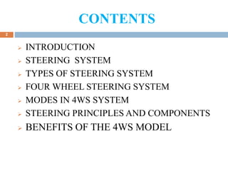 This document presents information on a 360 degree load carrier system with four wheel steering. It discusses the basic components and principles of steering systems, including types like front wheel, rear wheel, and four wheel steering. For four wheel steering systems, it describes the two main modes: rear steer mode for low speeds, where the rear wheels turn in the opposite direction of the front wheels to reduce the turning radius; and crab mode for high speeds, where all wheels turn in the same direction for stability. The document outlines benefits of four wheel steering like improved vehicle handling, reduced driver fatigue, and a smaller turning radius.