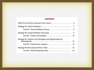 The document outlines an agenda for a 360 feedback session, focusing on receiving and sharing feedback, developing competencies, and self-development strategies. It includes guidelines for both giving and receiving feedback, understanding reactions to feedback, and analyzing feedback reports. Additionally, it provides tools and strategies for personal performance analysis and goal setting to improve professional development.