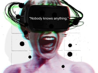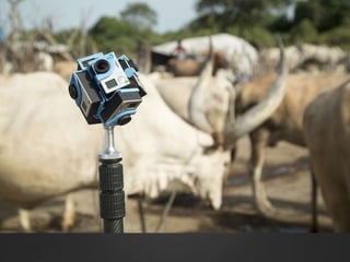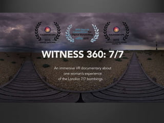 The document discusses new approaches to narrative and concepts of reality using 360 virtual reality. It explores how VR may enhance a reader's capacity for empathy by allowing them to literally enter the interior worlds of others. However, it also notes challenges, such as the risk of "poverty porn" or presenting only certain perspectives. The document also examines how VR can reconfigure concepts of truth and reality by showing multiple perspectives and narrative fallibility. It suggests VR may require considering the physical experience of the viewer in new ways compared to traditional media.
