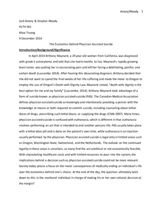 This document summarizes an essay analyzing the economics behind physician-assisted suicide. It discusses how legalizing PAS could lead to significant cost savings in healthcare by avoiding expensive end-of-life care costs. It presents concerns that patients may feel pressure from healthcare providers, families, or themselves to choose PAS to save money. However, from an economic perspective, legalizing PAS respects individual choice and leads to more efficient allocation of limited healthcare resources. The document applies concepts like marginal costs and benefits, opportunity costs, and externalities to analyze the issue from an economic framework.