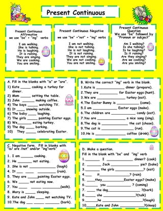 This document provides examples and exercises for using the present continuous tense in English. It covers the affirmative, negative, and question forms using "be" + "ing" verbs. There are multiple choice and fill-in-the-blank questions about common actions people and things are or are not doing, such as cooking, talking, laughing, raining, etc. An answer key is provided to check the examples and exercises.