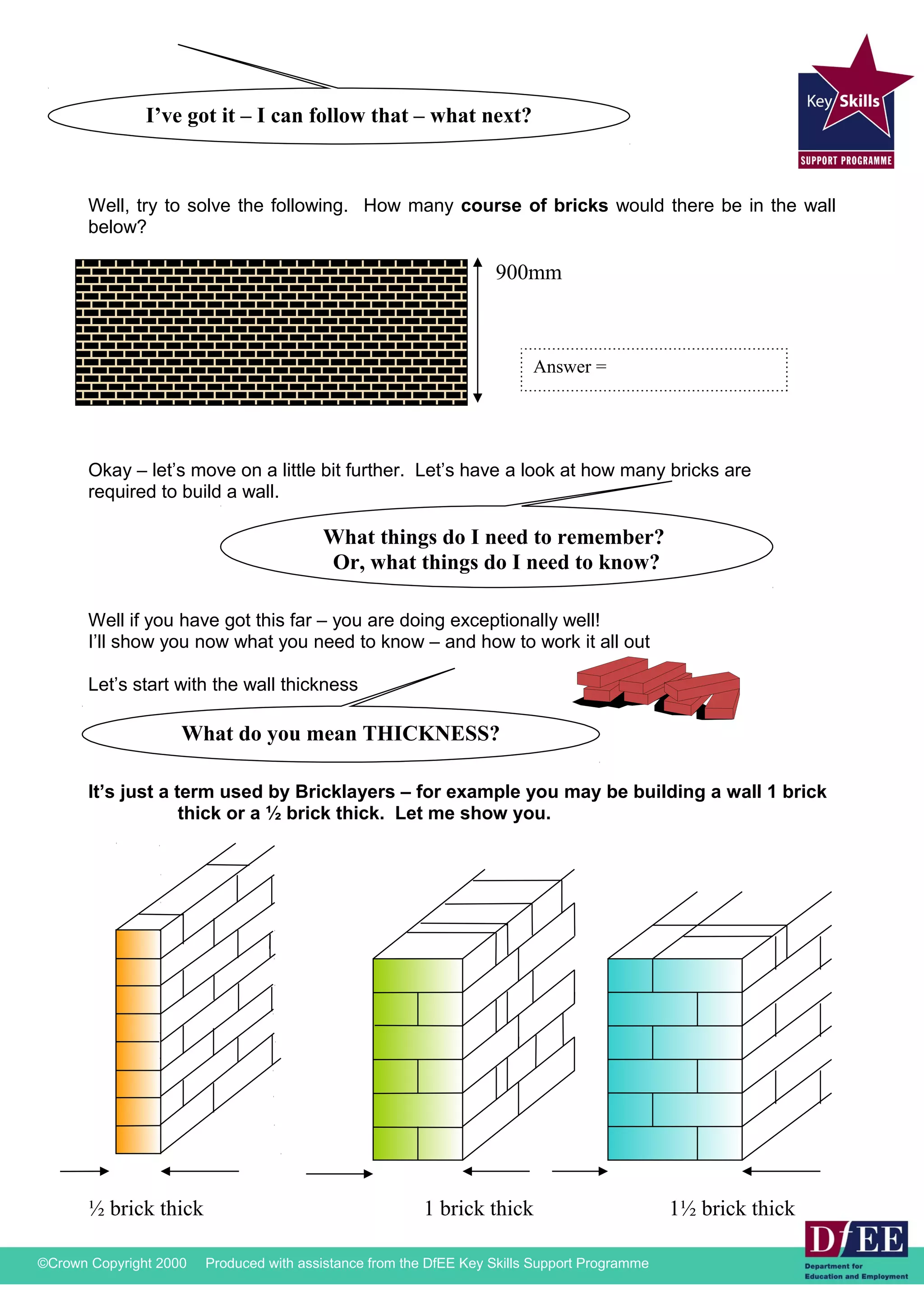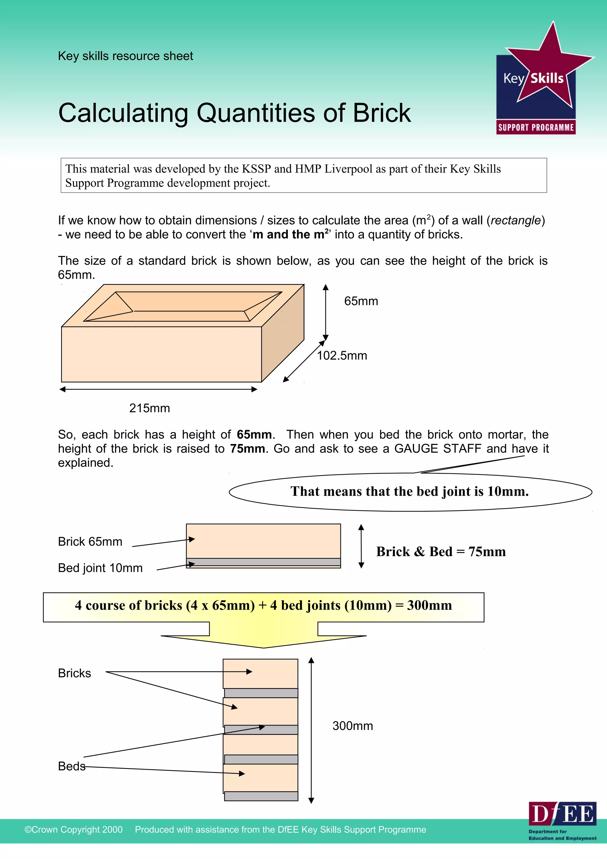 This document provides instructions for calculating the quantity of bricks needed for wall construction. It explains that the standard brick size is 65mm high plus a 10mm bed joint, for a total of 75mm per course. It also details that a wall that is 1 brick thick will contain 120 bricks per square meter. The document walks through an example of calculating the bricks required for a 10m by 2m wall that is 1 brick thick, which equals 2,400 bricks. It concludes by providing a multi-step process and asking the reader to calculate the bricks for another sample wall.