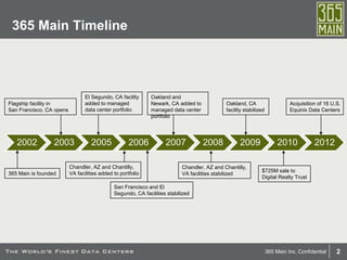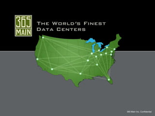 365 Main was founded in 2002 and has since grown to operate 16 data centers across the US comprising 280,000 square feet of space. The document provides an overview of 365 Main's history, strengths, investment highlights, customer services, data center portfolio, and a potential new modular data center solution called DINAB. Key details include 365 Main's experience in developing and operating large-scale data centers, its sale to Digital Realty Trust in 2010, and its focus on high-quality customer service.