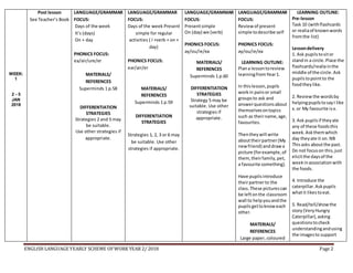This document provides a yearly scheme of work for English language instruction for Year 2 students in 2018. It outlines the topics, skills, standards, and lessons to be covered on a weekly basis throughout the year. The first week focuses on free time, self, family and friends. Lessons cover listening, speaking, reading, writing and language arts standards related to these topics. Specific activities are described like reading the story "The Very Hungry Caterpillar" and having students note what the caterpillar ate each day. Subsequent weeks continue building language skills while exploring additional topics.
