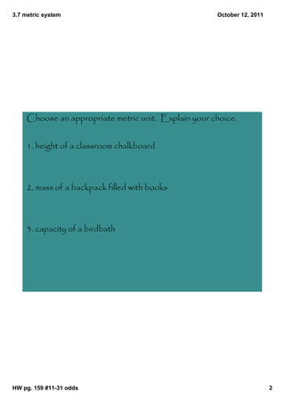 1. The document appears to be notes from a class on the metric system. It includes examples of converting between metric units and solving equations involving metric units.