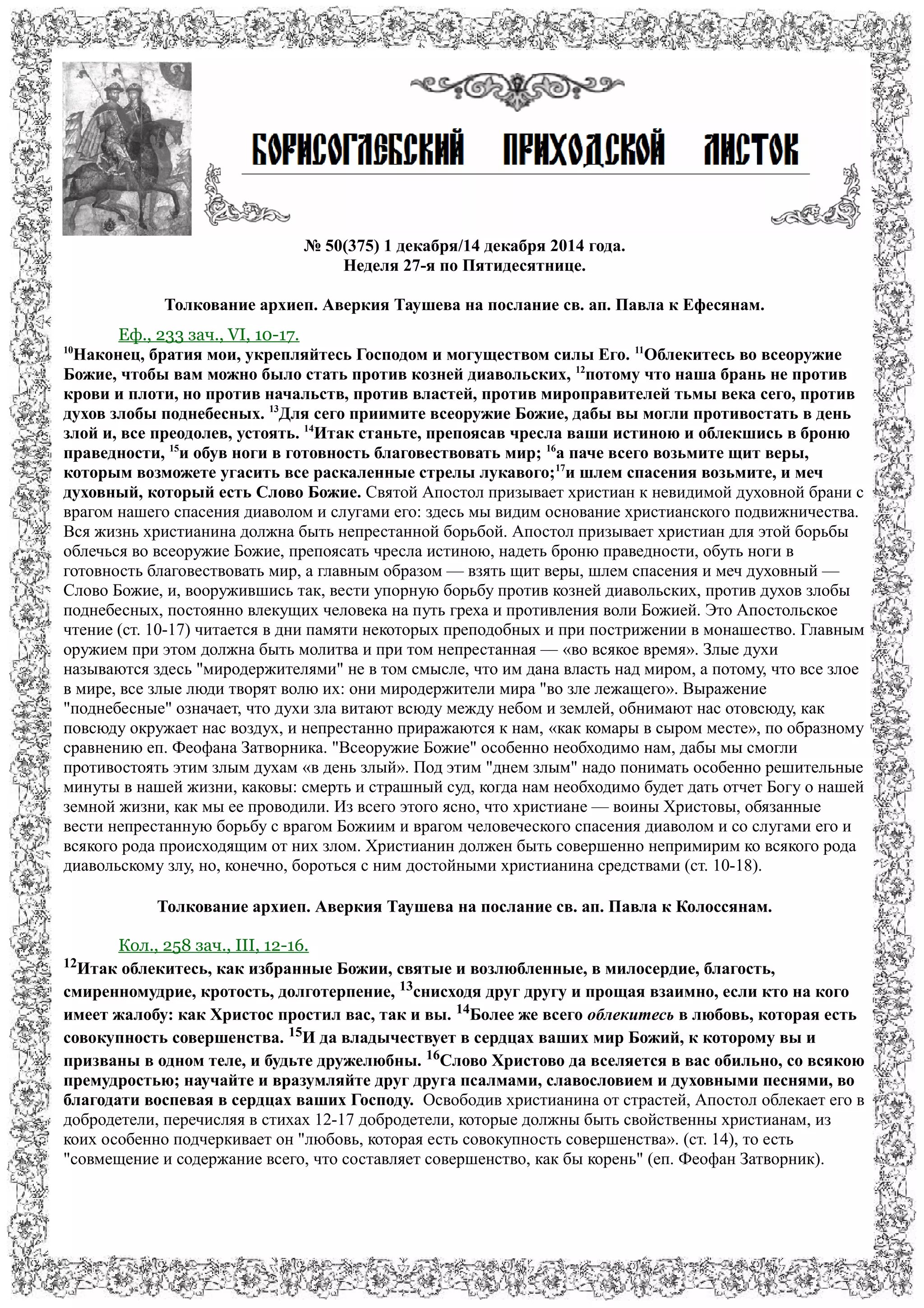 Документ содержит толкования архиепископа Аверкия Таушева на послания святого апостола Павла и Евангелие от Луки, акцентируя внимание на духовной борьбе христиан, необходимости добродетелей, таких как любовь и милосердие, и принципах христианского совершенства. В нём подчеркивается важность облечения в 'всеоружие Божие' для противостояния злым духам и призыв следовать за Христом, даже если это означает отречение от земного богатства. Основное внимание уделяется любви к врагам и постоянной духовной борьбе как важным аспектам христианской жизни.
