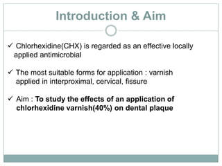This study examined the effects of applying a 40% chlorhexidine varnish on dental plaque. 40 volunteers participated in a clinical trial where their plaque levels, gingival bleeding, and bacterial colony counts were measured after applying the varnish or not applying anything. The results showed that applying the chlorhexidine varnish significantly decreased plaque levels and gingival bleeding in volunteers with poor oral hygiene. It also reduced the frequency of high bacterial colony counts. The varnish was most effective at reducing plaque for patients with high baseline plaque levels. Regular application of chlorhexidine varnish can be an effective way to reduce caries risk for patients with poor oral hygiene.