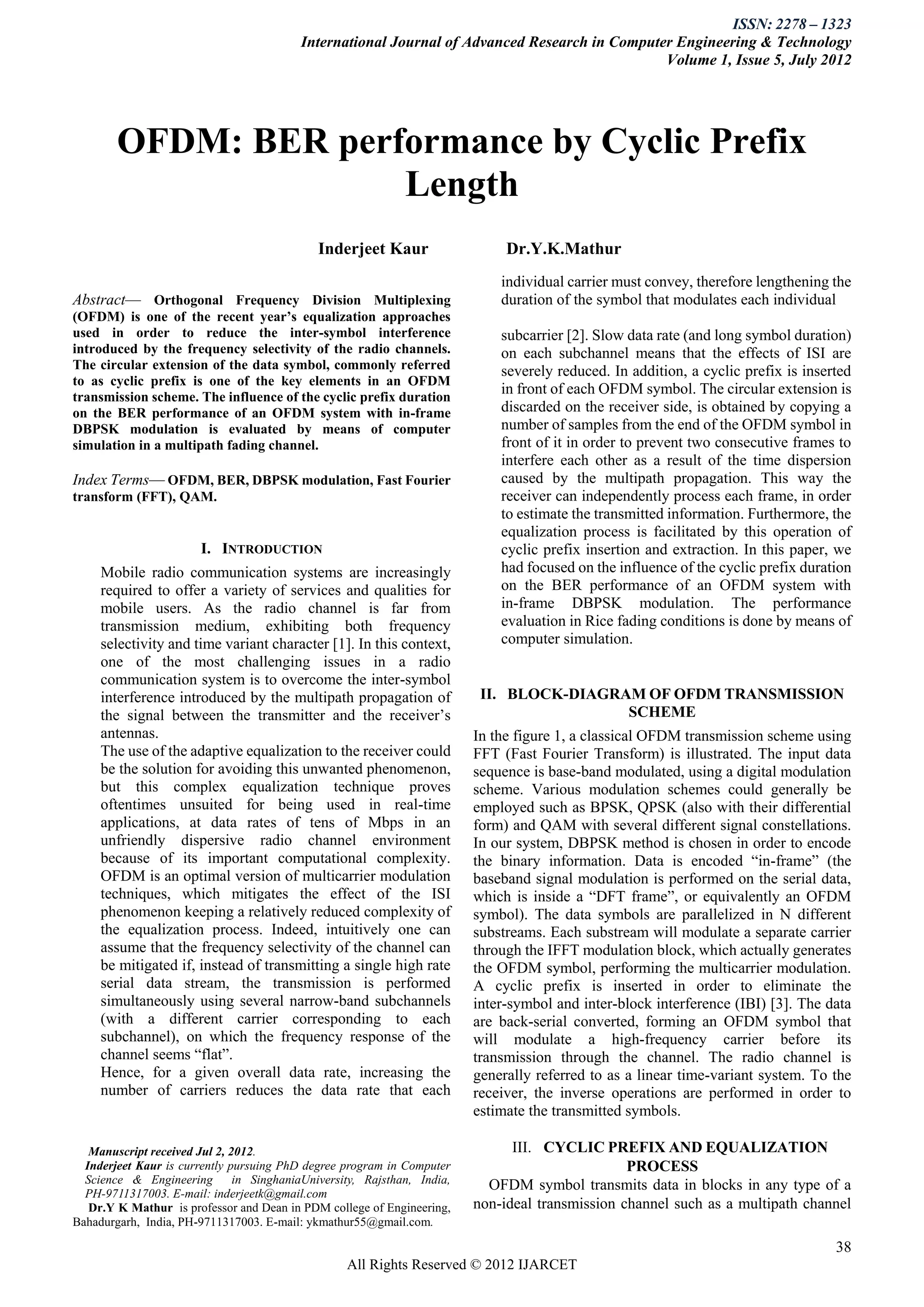 1) OFDM divides the frequency band into multiple narrow sub-carriers to combat frequency selectivity of channels. Cyclic prefixes are added to prevent interference between blocks.
