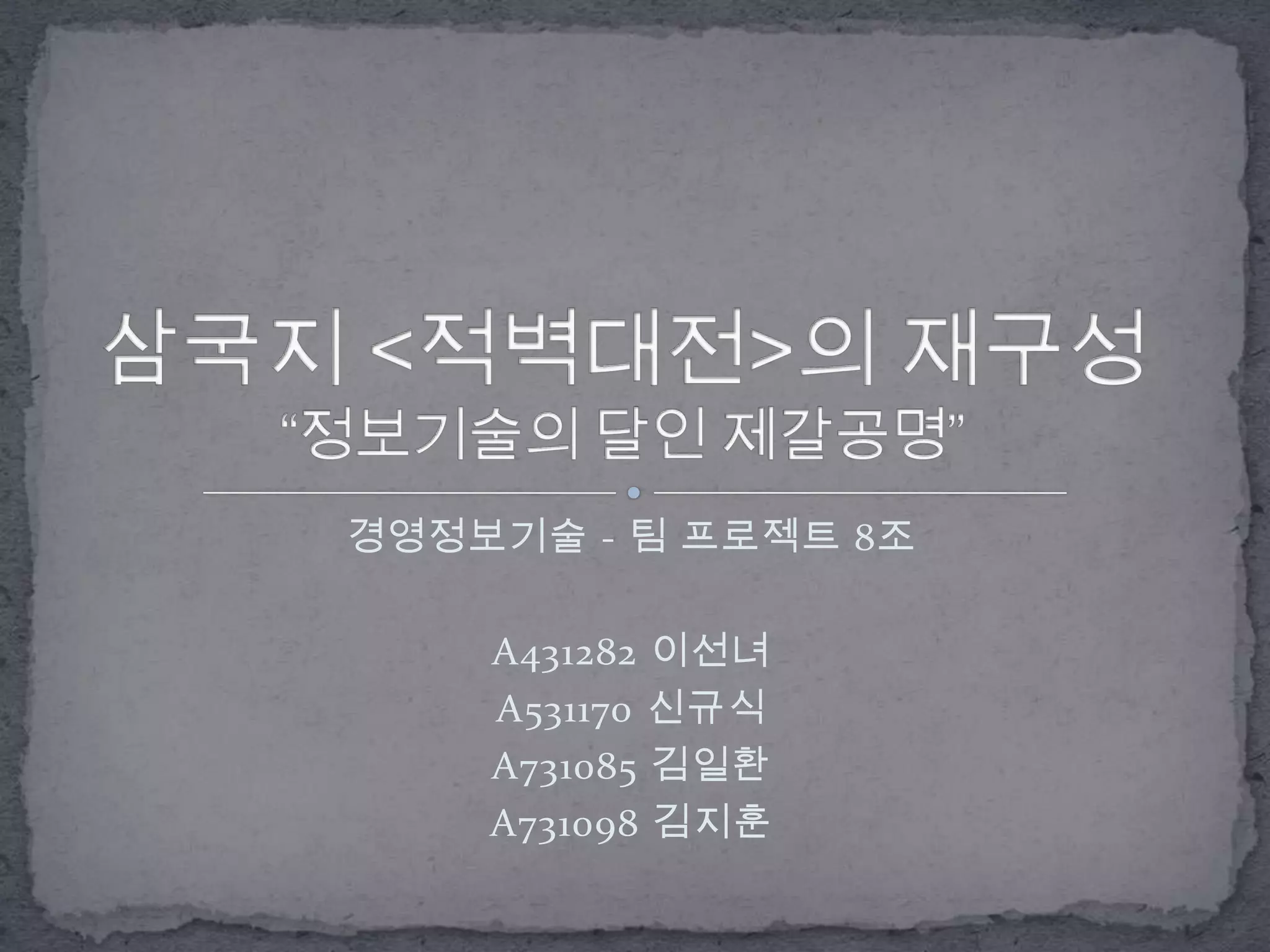 삼국지 <적벽대전>의 재구성“정보기술의달인 제갈공명”경영정보기술 - 팀 프로젝트 8조A431282 이선녀A531170 신규식A731085 김일환A731098 김지훈