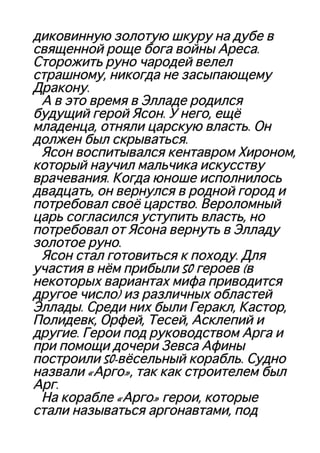 Документ рассказывает о мифе о Ясоне и аргонавтах, их поисках золотого руна, происходящих в античной Греции. В истории описываются приключения Ясона, его испытания от царя Аэта, а также помощь волшебницы Медея. В заключении упоминается, как на небе появились созвездия, связанные с персонажами этого мифа.
