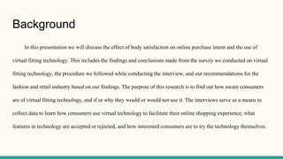 The document discusses findings from interviews about virtual fitting technology. Key findings include: