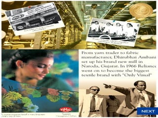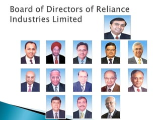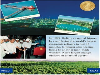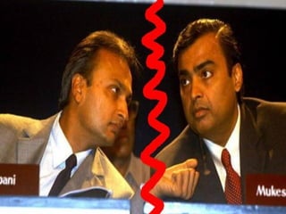 Reliance Industries was originally a single company founded by Dhirubhai Ambani that later split into two separate companies led by his sons Mukesh Ambani and Anil Ambani in 2005. Reliance Industries Limited, led by Mukesh Ambani, is India's largest private sector conglomerate operating in petroleum refining and marketing, petrochemicals, oil and gas exploration, and retail. It also has major subsidiaries and associates operating across various industries.