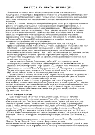 Документ рассматривает статус Плутона как планеты и развитие международного астрономического сотрудничества. В результате многолетних наблюдений и исследований, в 2006 году Международный астрономический союз переопределил Плутон как карликовую планету, что стало предметом широких дебатов среди ученых. В документе также обсуждаются открытия спутников Плутона и других объектов пояса Койпера.