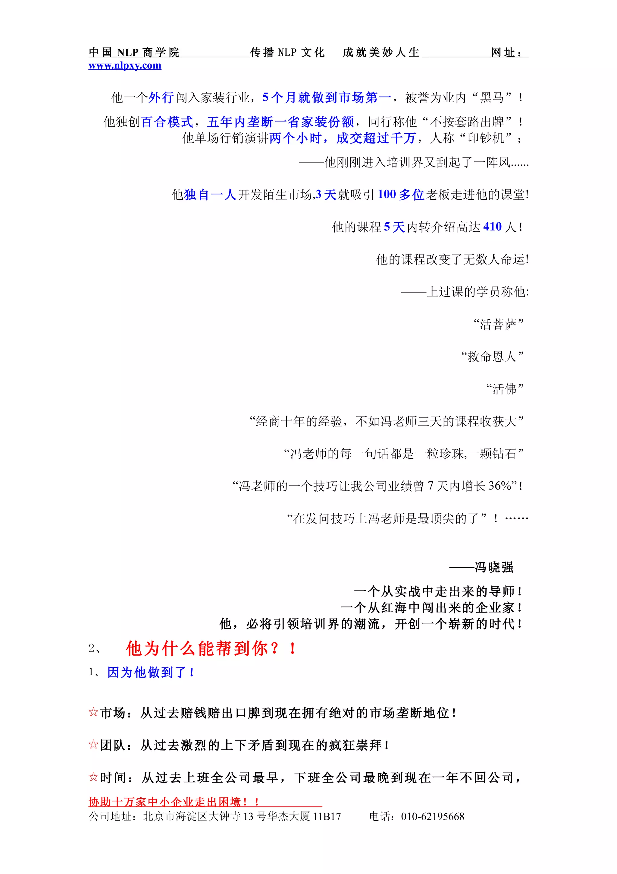中国NLP商学院旨在通过冯晓强的课程帮助企业提高利润和员工积极性,而冯老师以其实际经验和成功案例著称。他的培训课程强调简洁、实战和系统性,吸引了众多企业家的参与,并获得了显著成效。学员反馈表明,课程内容改变了他们的业绩和经营理念。